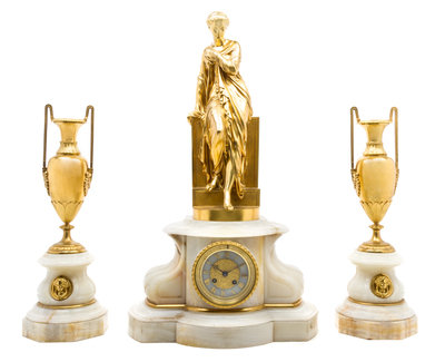 having a circular dial with Roman numeral hours and signed E. Gaultier and J. Albinet set within a shaped case surmounted by a figure of a robed classical maiden, together with a pair of amphora form elements.