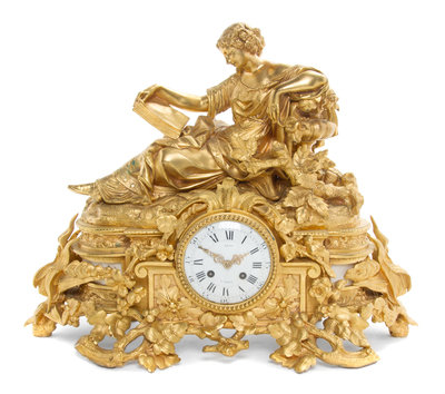 having a circular dial with Roman numeral hours and Arabic minutes, signed Dent a Paris, surmounted by a lounging maiden reading and over a foliate decorated case raised on foliate branch form feet.