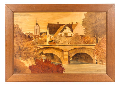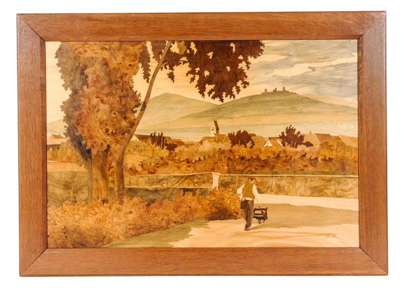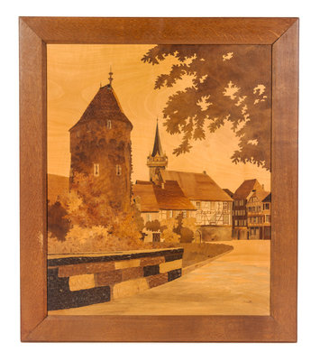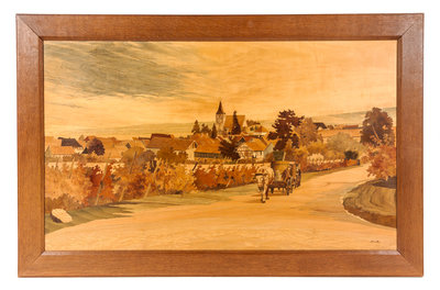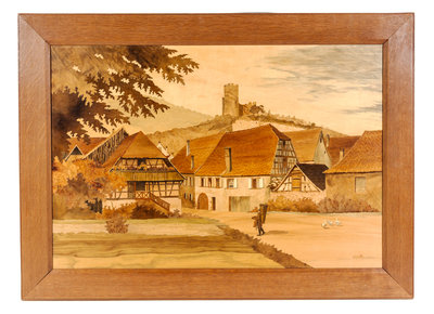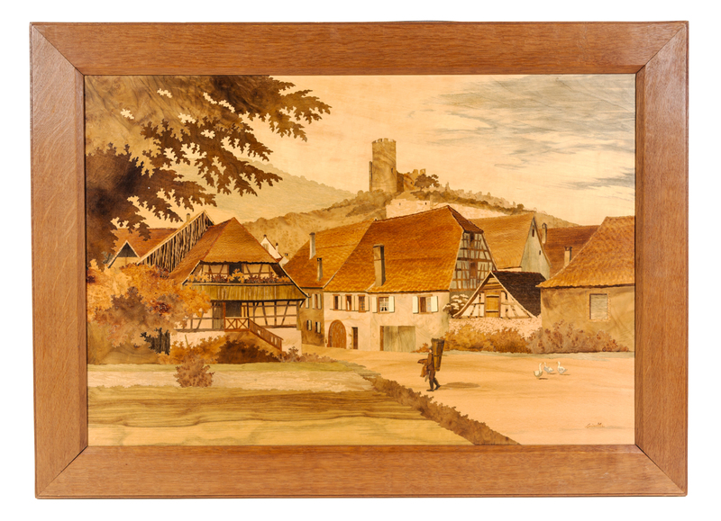 each panel in various woods, depicting an Alsatian village.