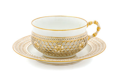 each with hexagonal reticulation, the cup with floral cut-outs, both with gilt bands and a crowned N mark, the cup dated 1860, the saucer 1866.