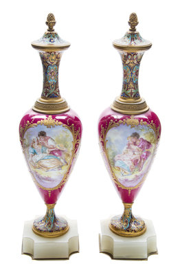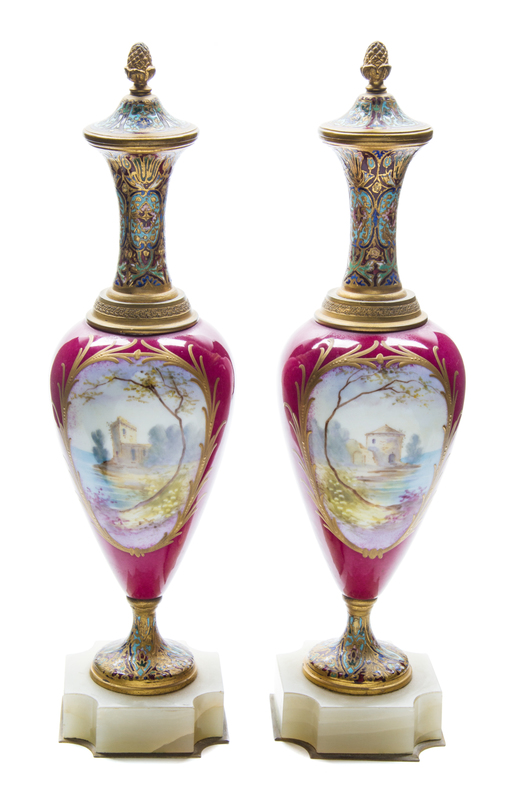A Pair of Champleve and Gilt Metal Mounted Sevres Style Porcelain Vases