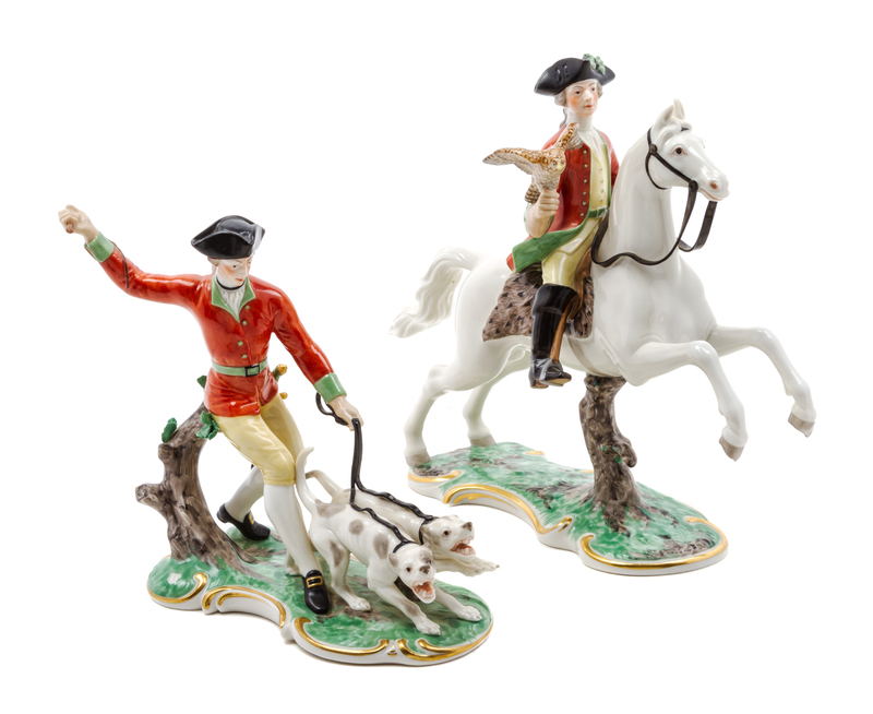 each showing a hunting scene, one of a man on horseback with a bird resting on his arm, the other of a man with hunting dogs.