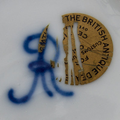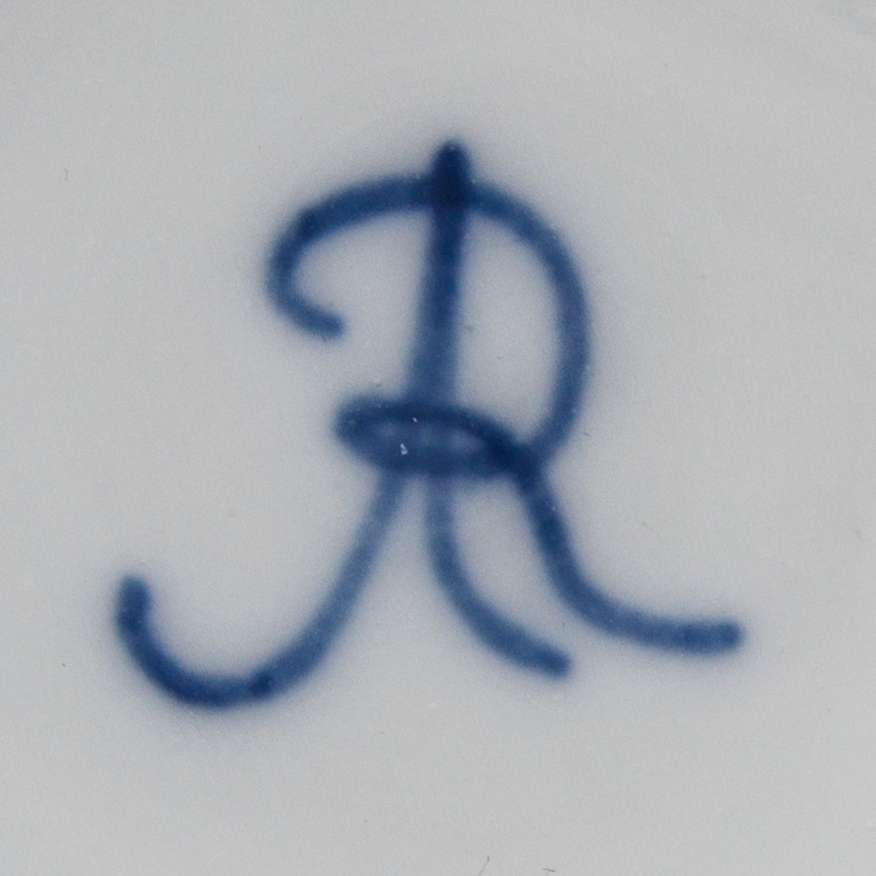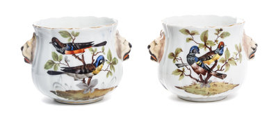 each of low, ribbed form with lion mask handles, decorated with birds on leafy branches and insects, having Augustus Rex marks in underglaze blue.
