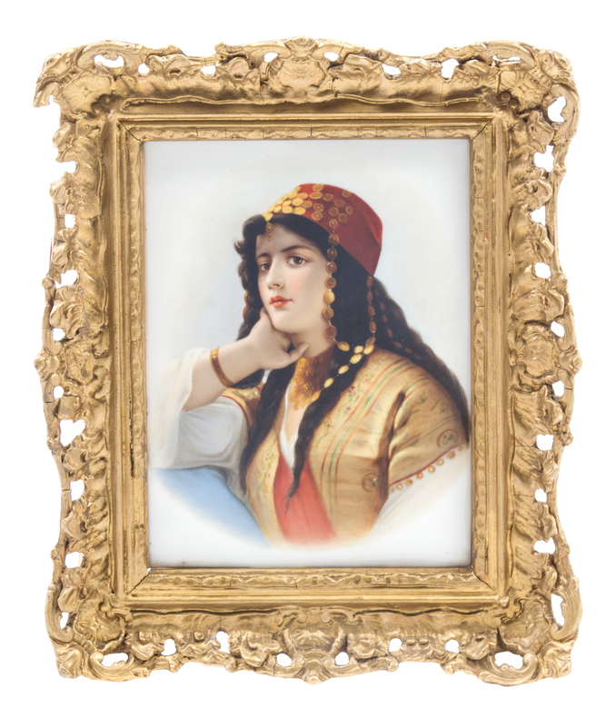 depicting an Egyptian maiden in traditional costume, impressed KPM with sceptre, further impressed H and incised 7 3/4 - 5 3/4, set in a giltwood frame.