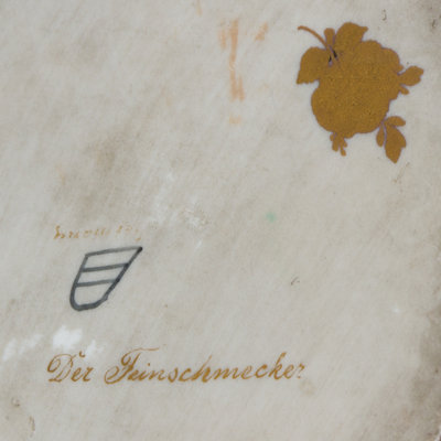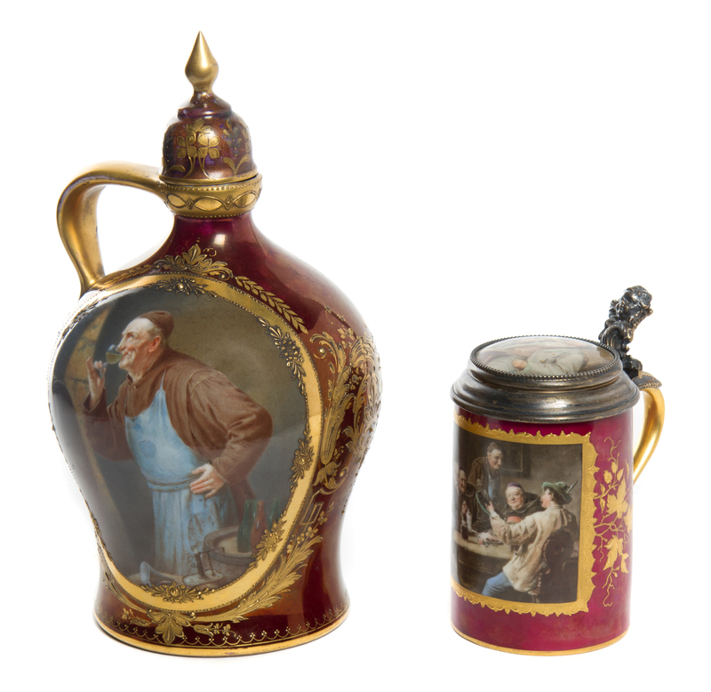 comprising a jug titled DER FEINSCHMECKER decorated with a monk sampling wine and a stein decorated with a tavern scene, each with shield mark to base.