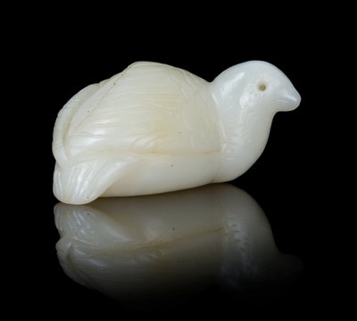 the near-white stone in the form of a recumbent quail with legs tucked underneath, the plump body finely carved with rows of feathers.