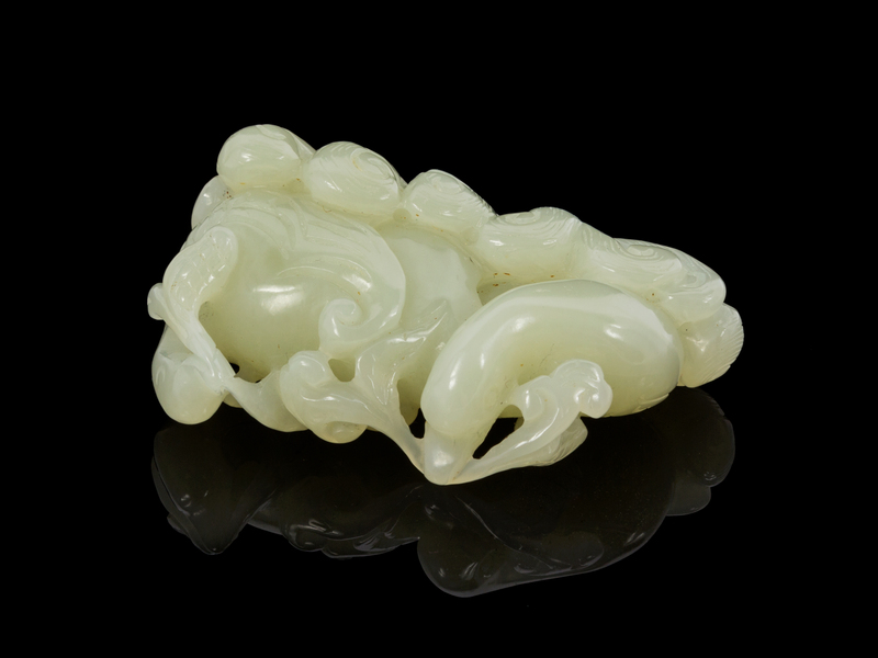 the even celadon stone depicting two recumbent duck facing opposite directions, both bearing rice stalks in their beaks, above waves.