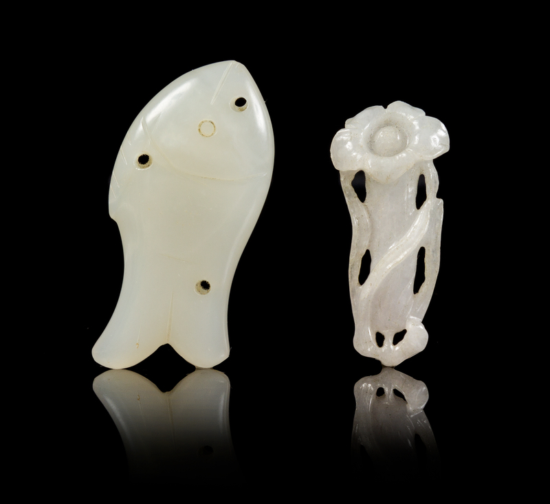 the first a white jade fish shaped pendant, the second a white jadeite pendant in the form of floral branch.