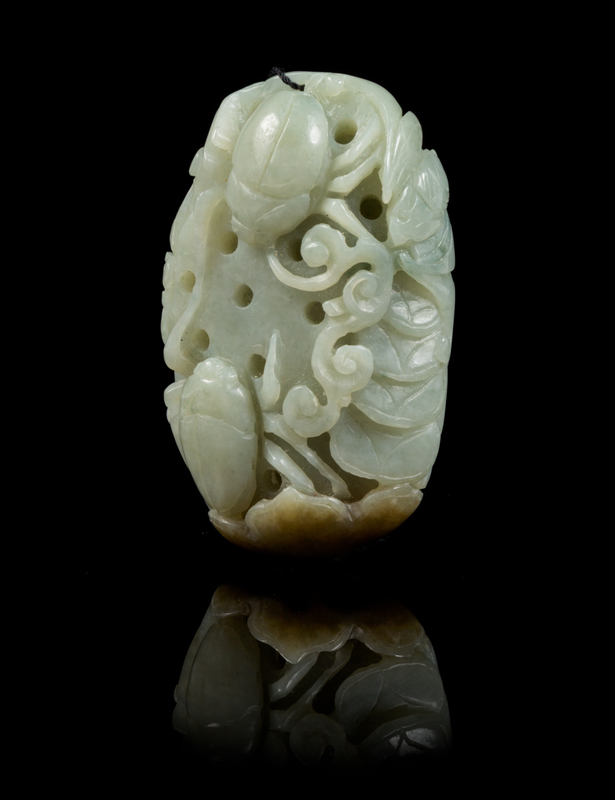 the celadon stone relief carved depicting two insects climbing onto a lotus pod, circled by two bats and a strand of coins, carved to the russet skin highlighting lingzhi, the reverse with further lingzhi decoration.