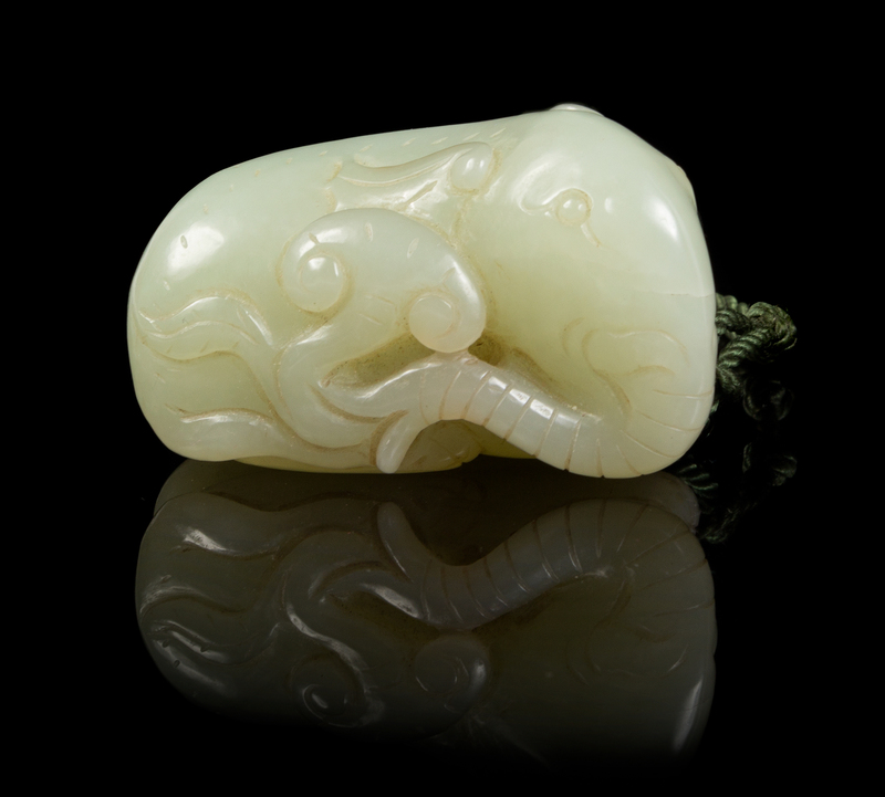 the even celadon stone carved to depict recumbent elephant with its head turned right and the long nose holding a lingzhi spray.
