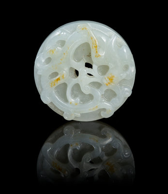 of a greyish, white stone with russet skin, depicting a chilong holding lingzhi in its mouth, resting on a bi disc worked to show basketweave to the underside.