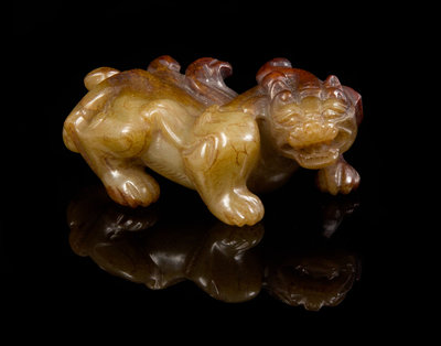the celadon and russet stone carved in the form of bixie, the crouching beast with its head turned to the right and its mouth wide open showing the teeth and fangs, having two wings issuing from the front legs and a bifurcated tail, the paws incised with details.