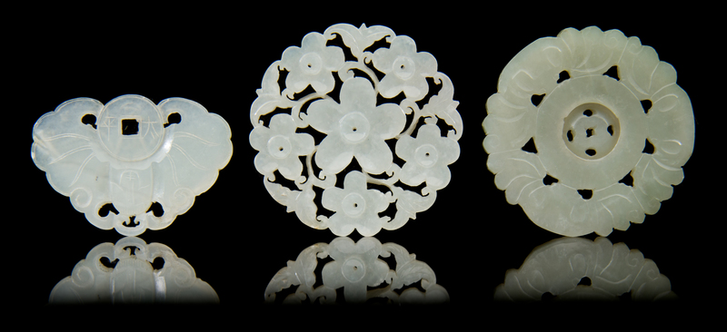 the first a translucent white stone carved to show a fu bat and a coin incised with two characters taiping, the second a white stone pierced with flowering prunus, the third a celadon stone having a central bi circled by a three bats.