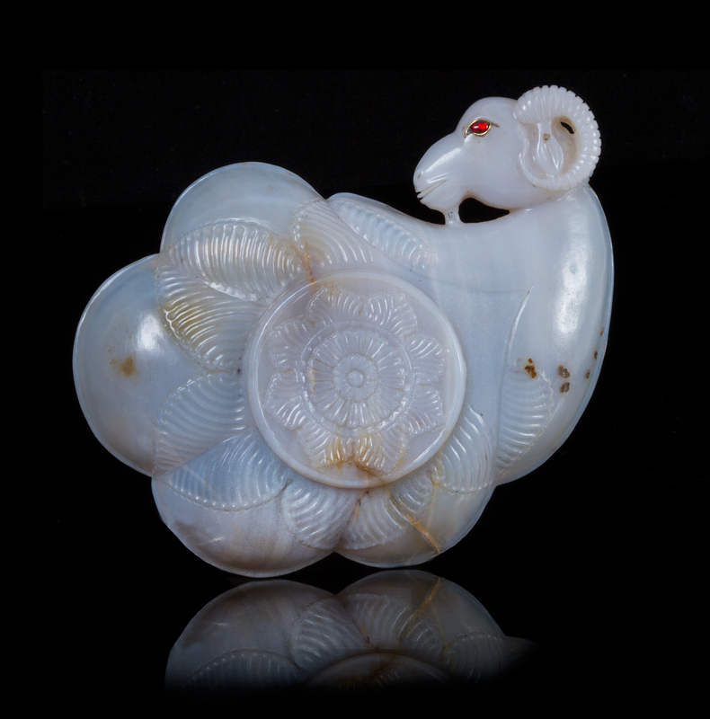 of an opaque light gray stone, the exterior of the flower-shaped body elegantly carved with lobed lines and a large chrysanthemum flower-head with rows of petals and leaves radiating from the center of the foot, the handle in the form of a ram's head with its eyes with red glass beads within gold rims.