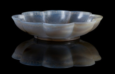 of an opaque gray stone, the exterior of the foliate rim carved with a band of lappet leaves, the underside depicting a chrysanthemum blossom.