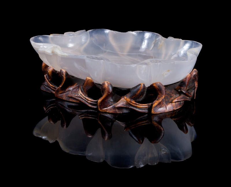 the translucent white stone carved in the form of a large lotus leaf with several lotus buds emerging from the bottom, raised atop a fitted wood stand also carved as a lotus leaf.