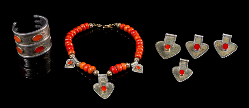 comprising a silver bracelet with niello inlay and geometric design, inset with oval carnelian panels, four cordiform pendants having similar decoration, a necklace with coral beads and three cordiform pendants with oval carnelian insets.