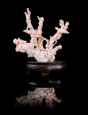 of light pink color, carved to depict a female immortal wearing long robes with flowing scarf, her right hand holding a fan, the attending standing next to her bearing a flag with a shuai character, backed by tree trunks and leafy branches, raised on a fitted hardwood stand.