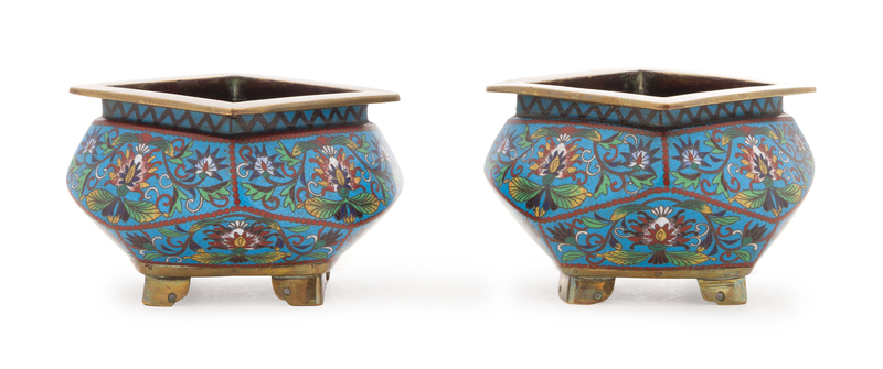 each of faceted form raised on four bracket supports and a square mouth, decorated with lotus scrolls against a blue ground.