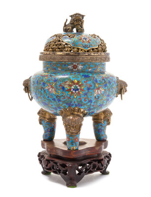 the compressed ovoid body flanked by a pair of lion-mask and loose-ring handles, rising from three curved legs applied with further lion masks to a recessed waist stopping at a mouth decorated with key-fret border, having lotus scrolls throughout against a blue ground, the domed cover having similar decoration and reticulated panels with clusters of ruyi clouds, surmounted by a fu lion finial, the base incised with a four-character Qianlong mark, raised on a fitted wood stand pierced with lotus motif.