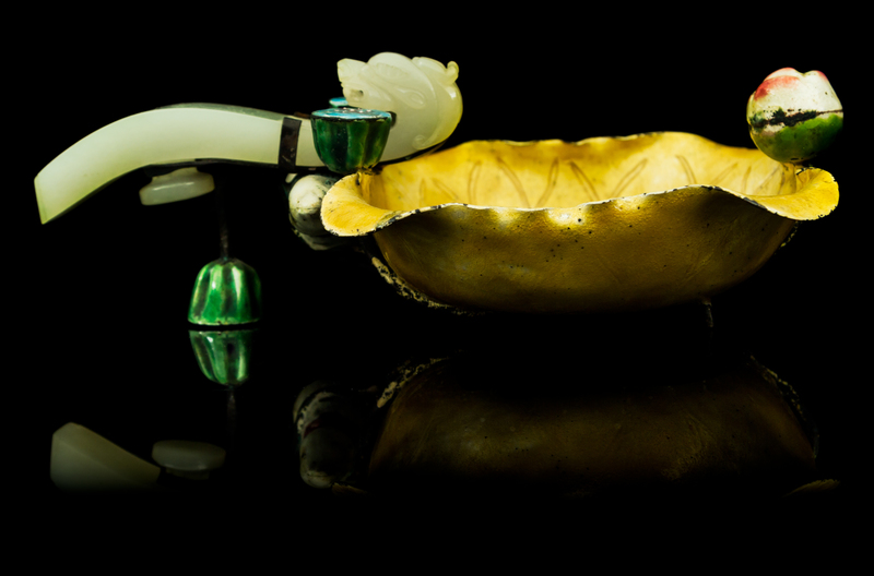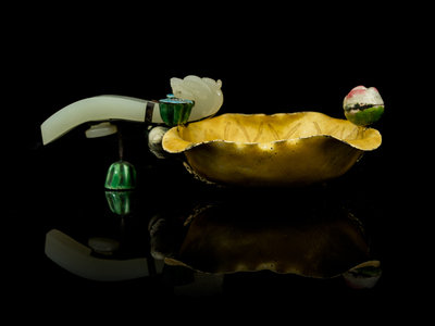 the yellow enameled cup in the form of a large lotus leaf having lotus bud and lotus pod rising from the base, having a celadon jade dragon belt hook forming the handle.