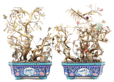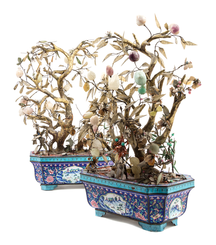 A Pair of Enamel Jardinieres With Hardstone Fruits