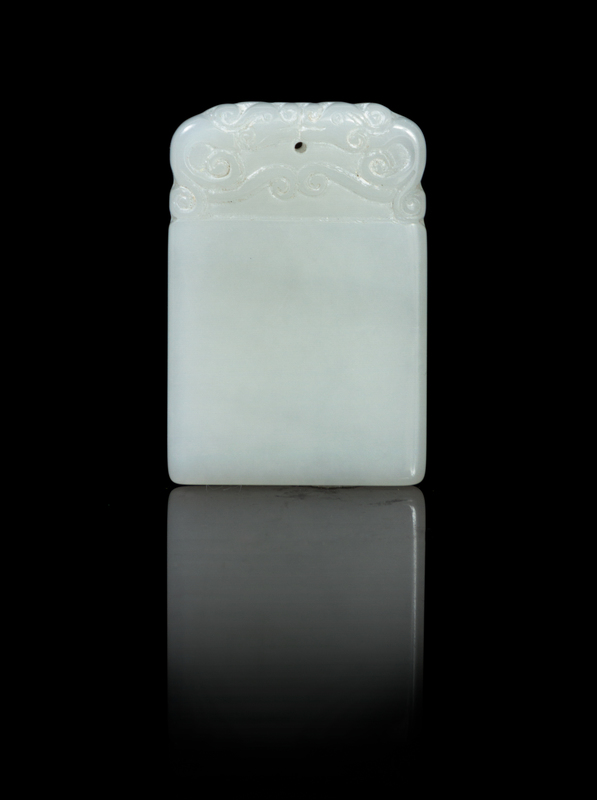 of an even white jade stone, of rectangular from, the plain body surmounted by a pair of confronting chilong.