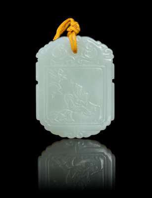 the even celadon stone having lobed headcrest decorated with two confronting kuilong, the front carved with a square panel enclosing a maiden sitting under lingzhi issuing from rockwork, the reverse with fu shou characters.