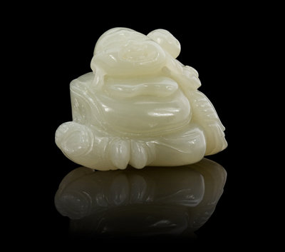 the even stone depicting a robed seated Budai laughing with his right hand bearing prayer beads with the left hand holding the opening of the bag, a small child climbing onto the Buddha's back.
