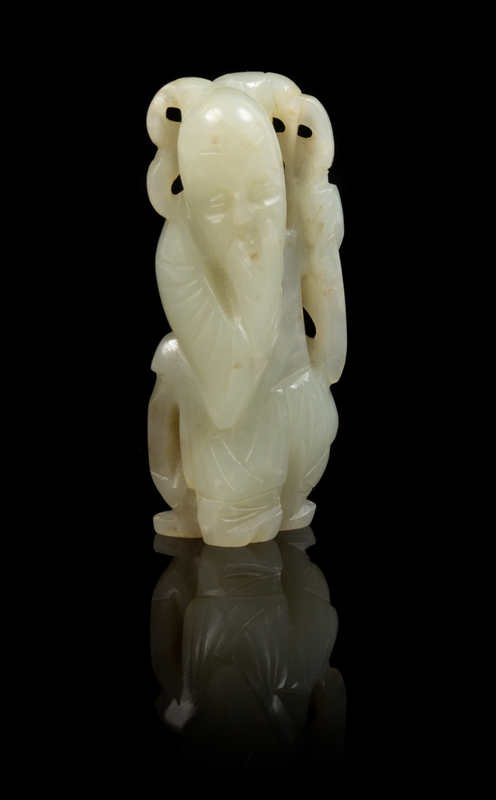 of a pale celadon stone, depicting the bearded immortal of longevity, Shoulao, bearing peach branches, with a dog sitting behind him.