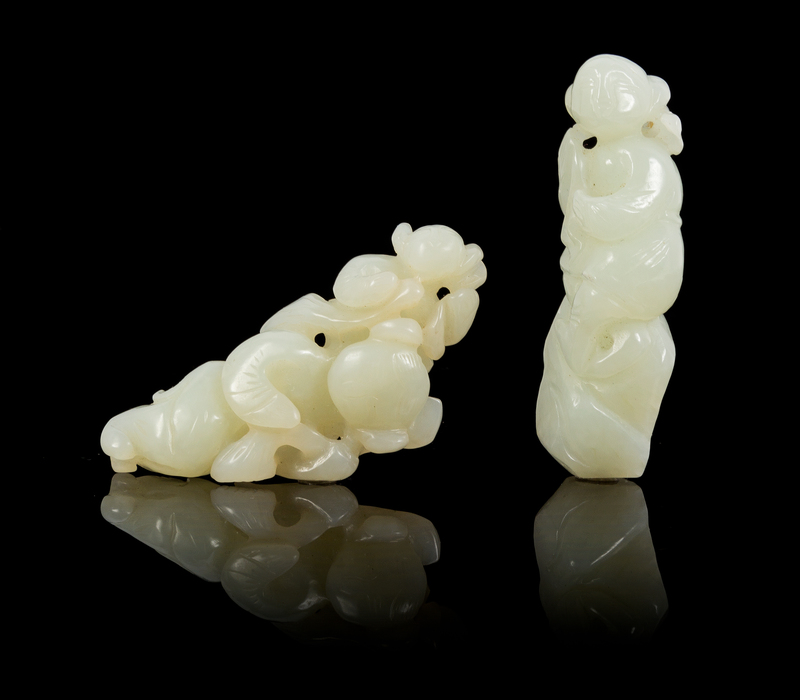 one depicting a reclining figure grasping lotus pod with another figure on his back, the other a child seated atop rockery holding lingzhi sprig in hands, gazing into the distance.