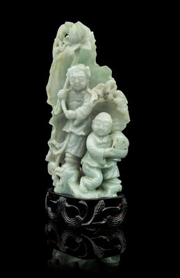 the pale green carved to depict immortals He He Er Xian standing in front of a lotus leaf, raised on a fitted hardwood stand having openworked floral decoration.