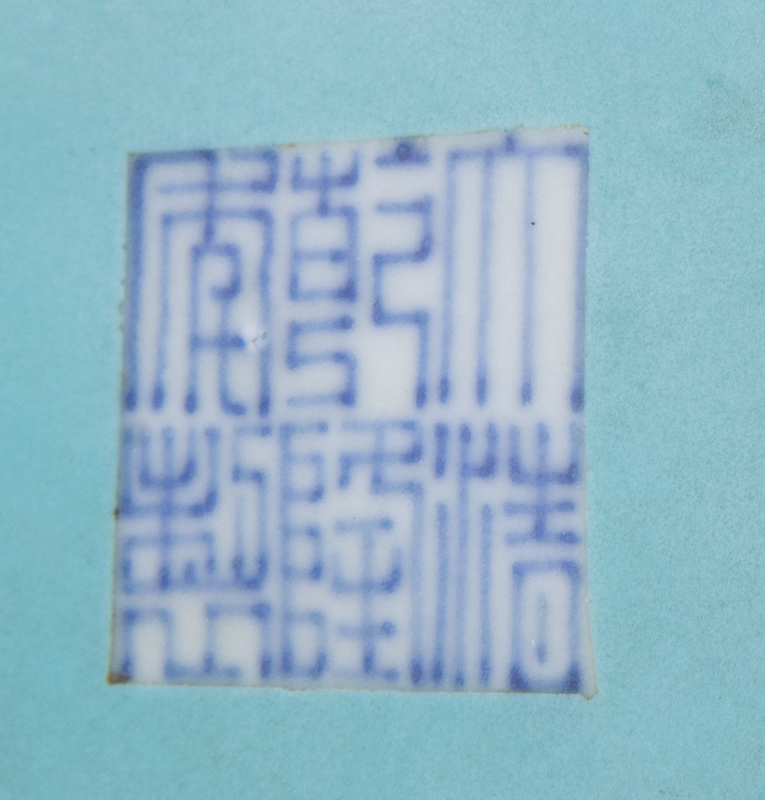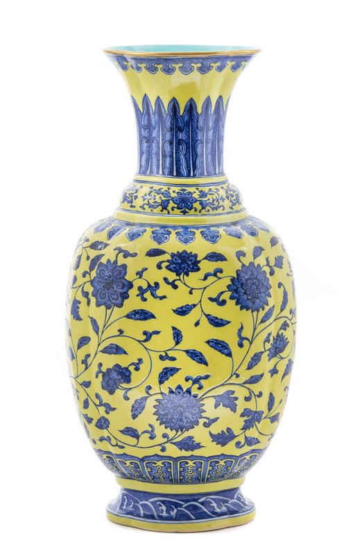 the baluster vase with lobed lines, the main panel painted with entwined lotus scrolls, between a band of lappet leaves and a band of lotus sprays, the neck with overlapping plantain leaves below a ruyi border painted to the quatrefoil-form mouth, the splayed foot also in quatrefoil form with wave motif, all against a bright yellow ground, the base covered in a turquoise glaze with a six-character Qianlong mark in underglaze blue.