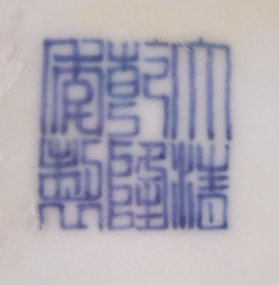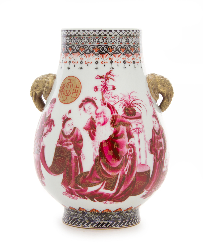 of zun form, the front painted with immortals, the reverse with inscriptions, flanked by a pair of gilt decorated elephant head-form handles, bearing an apocryphal six-character Qianlong mark in underglaze blue to the underside.