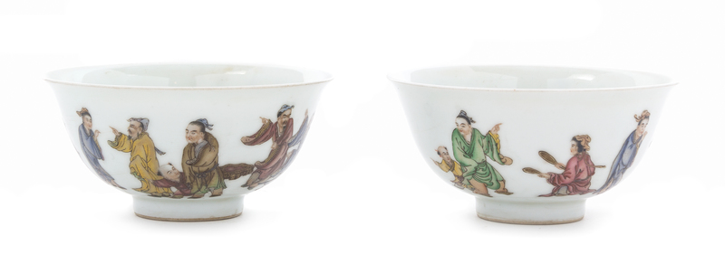 each having rounded sides, rising from a straight foot to a slightly everted mouth, the exterior painted with scholars and attendants in various pursuits, four vertical lines of inscription and three seals taiping, sheng, shi, the base enameled with a four-character Qianlong mark within a square.