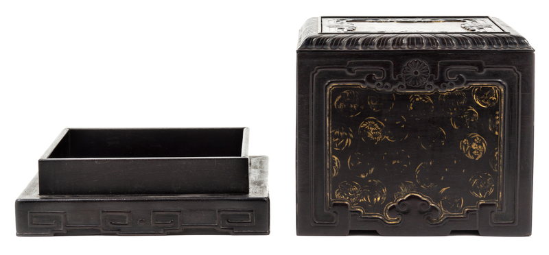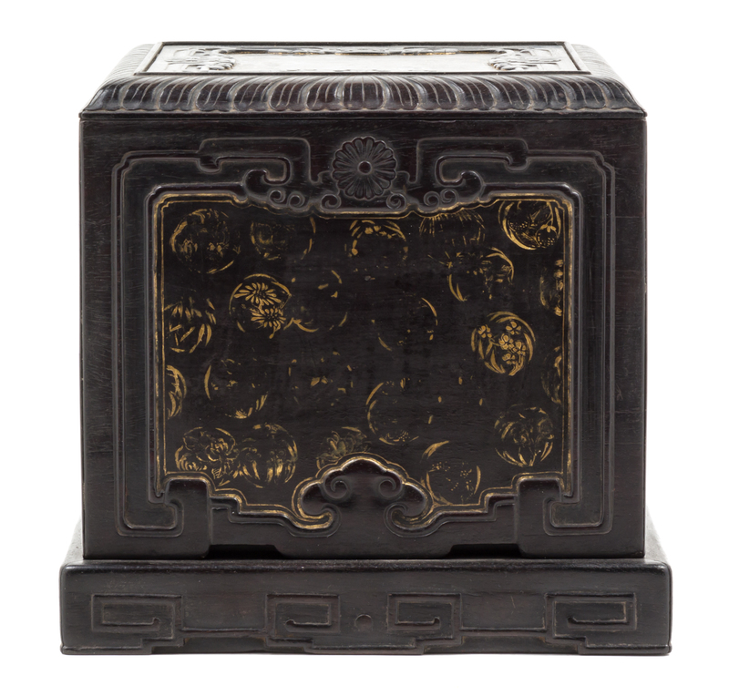 of square section, the top plinth of the cover carved with a square panel with indented corners enclosing various gilt floral roundels, circled by stylized kuilong and chrysanthemum heads and further surrounded by a overlapping chrysanthemum leaf border, the other four sides decorated similarly, the stepped base having low relief carved scrolled decoration.