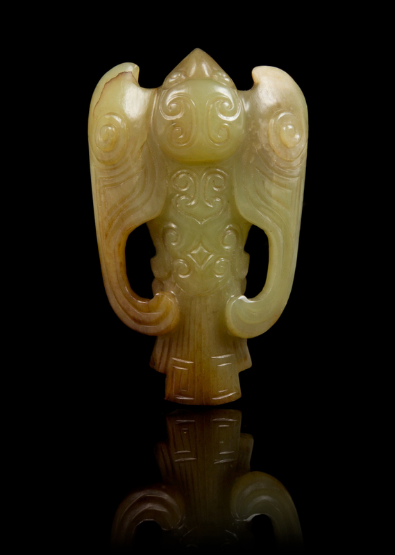 the yellow stone having darker areas, in the form of a winged bird, the body incised with C-scroll decoration, the face, the wings and the tail with finely carved details, the reverse carved to depict two claws.