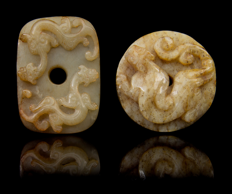 the first a celadon stone with russet veinings, of rectangular form with rounded corners, the front carved in high relief depicting two crouching chilongs, the back with C-scrolls, the second a yellow bi with dark specks and streaks, having a chilong resting atop.