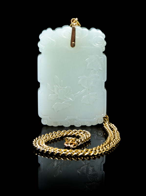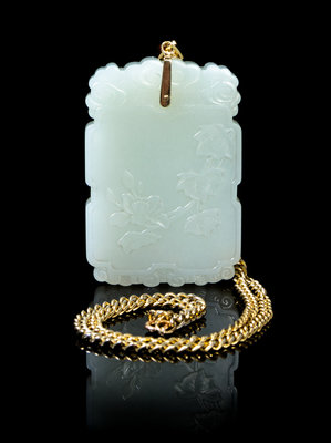 of a near-white stone, the shaped pendant depicting a floral blossom within raised and ruyi decorated borders, the reverse with incised imperial poem.