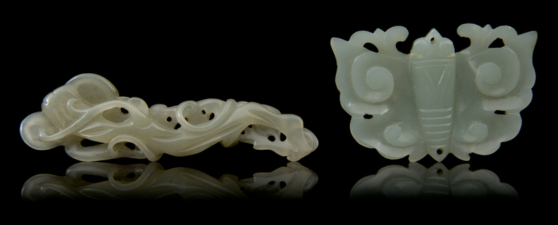 the first a greyish celadon stone carved and pierced to depict a ruyi scepter entwined by various small lingzhi sprigs, the second a pale celadon stone in the form of a butterfly.