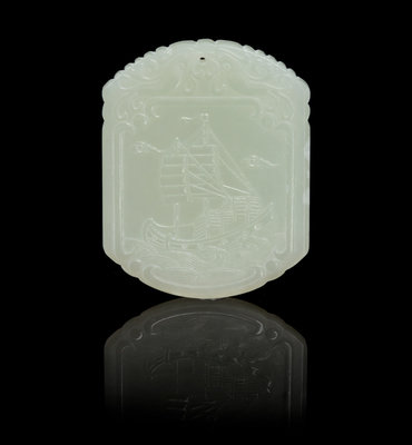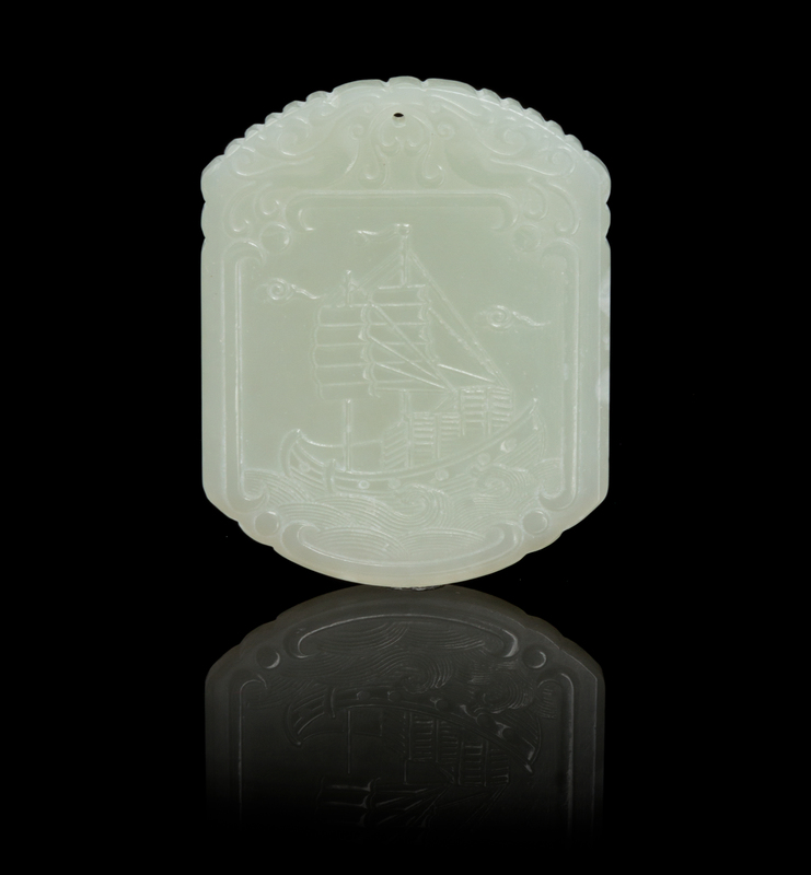 the front centered with a shaped panel enclosing a junk above waves, the reverse with four characters jixiang ruyi ("good luck and happiness"), all below two confronted stylized phoenixes.