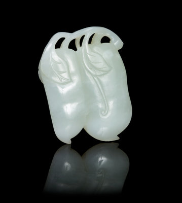 of a pale celadon stone, having white inclusions, depicting two melons with relief carved leafy vines.