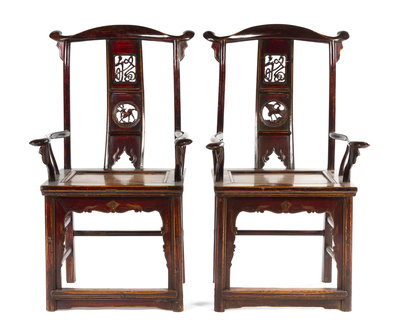 each having a pierce carved splat worked to show a shou character and a stag medallion, flanked by sinuous arms above a planked seat, raised on square legs with rounded fore-corners joined by a footrest and stretchers.