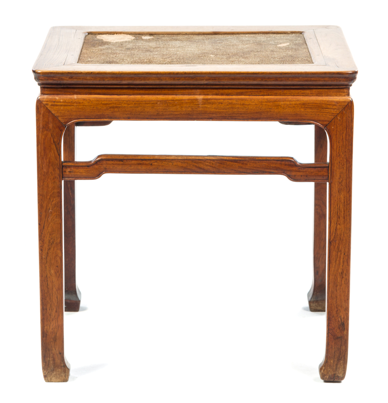 the square rush seat within planked edge, raised on square legs joined bydouble scroll stretchers, ending in scroll feet.