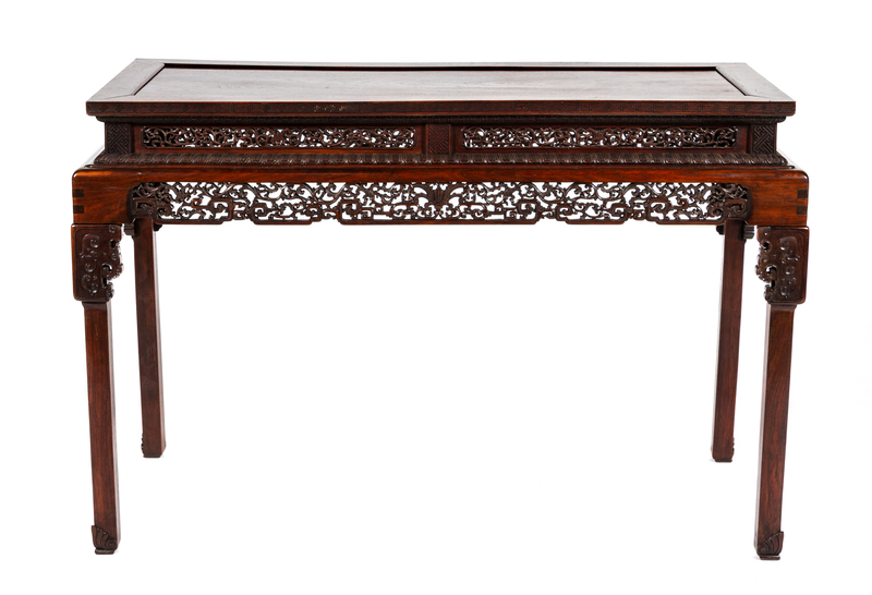 having a rectangular plank top with leiwen sides over a recessed, florally pierce carved frieze above a register of carved lappets over a pierced apron with carved foliate scrolls, raised on block legs, ending in scrolled feet.