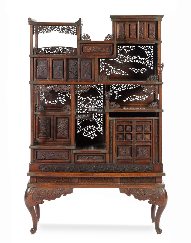 pierce and relief carved throughout to show birds amongst floral sprays and ruyi clouds, Buddhistic emblems, mountainous landscapes and various floral blossoms, the edges line inlaid to show greek key and archaic scrolls, raised on cabriole legs.