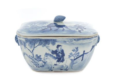 of rectangular form with indented edges and corners, the exterior decorated with figures and horses under pine trees issuing from rockery in a landscape scene, the shoulders flanked by two elephant head-form handles, the interior with swimming carps amongst seaweed decoration, the cover painted to depict a male figure training a horse within an outdoor scene, signed Kong Zhang, having a lotus bud shaped finial, bearing a four-character Daoguang mark in underglaze blue to the underside.