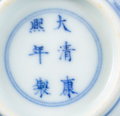 the deep rounded sides painted to depict a scholar and fisherman on a riverside beside rockery, bearing a six-character Kangxi mark in underglaze blue mark within double rings to the underside.