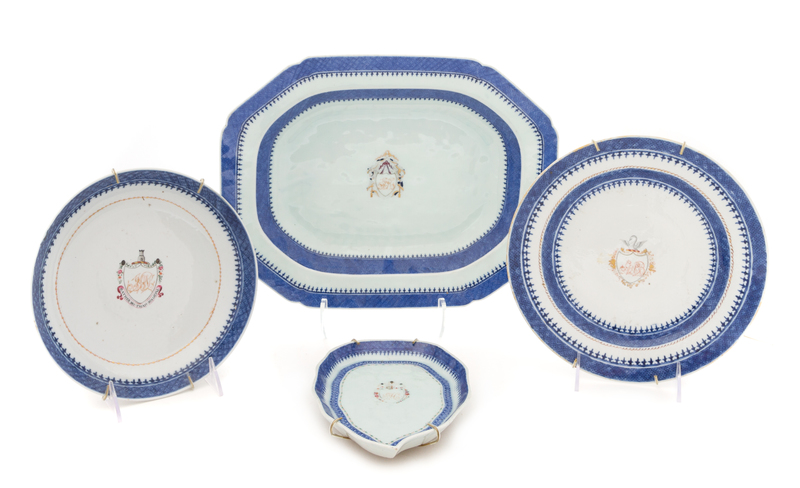 comprising a circular plate, a leaf-form saucer dish, a large octagonal platter with indented corners, each with a central coat-of-arm and a blue diaper border and a shallow plate decorated with a central coat-of-arm and a motto 'Rather Die Than Disloyal,' having a blue diaper border.