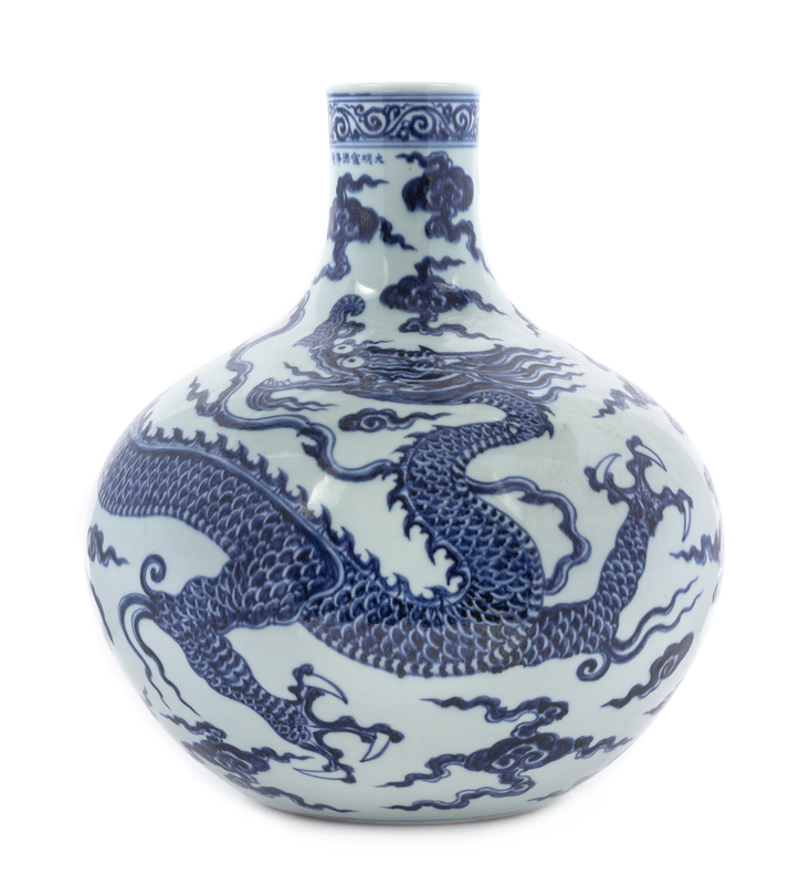 the ovoid body having a cylindrical neck, decorated throughout with a writhing dragon chasing the flaming pearl amid ruyi clouds, the neck decorated with foliate scrolls and having a six-character Xuande mark in underglaze blue.
